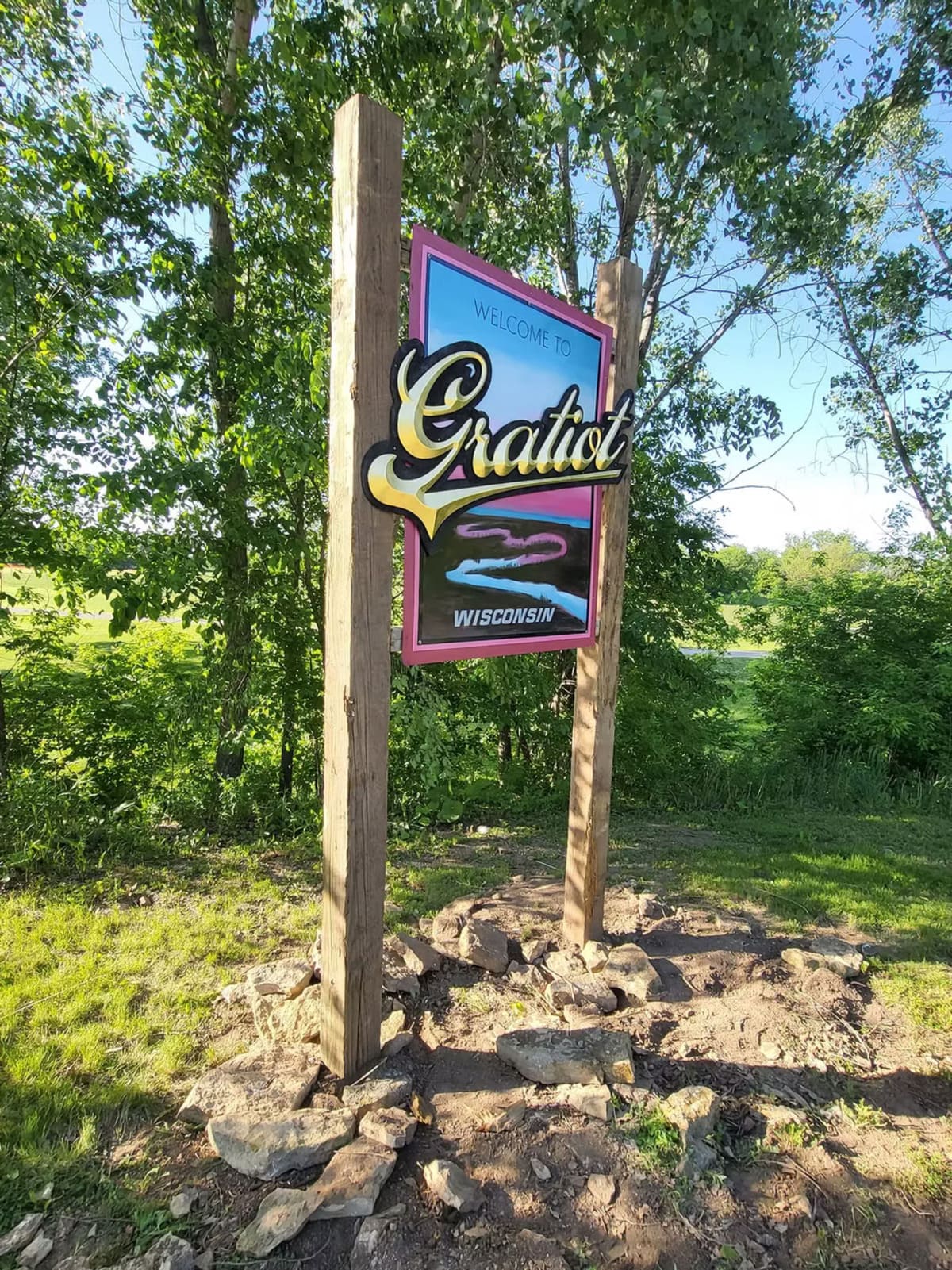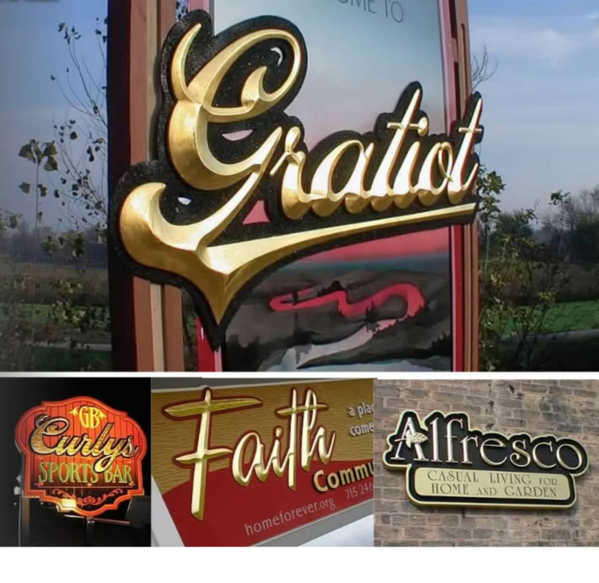 Gratiot, WI shown here with 24k Gold Leaf, Sculpted Lettering with Prismatic Bevels, and Smaltz. Extremely Outdoor Durable.