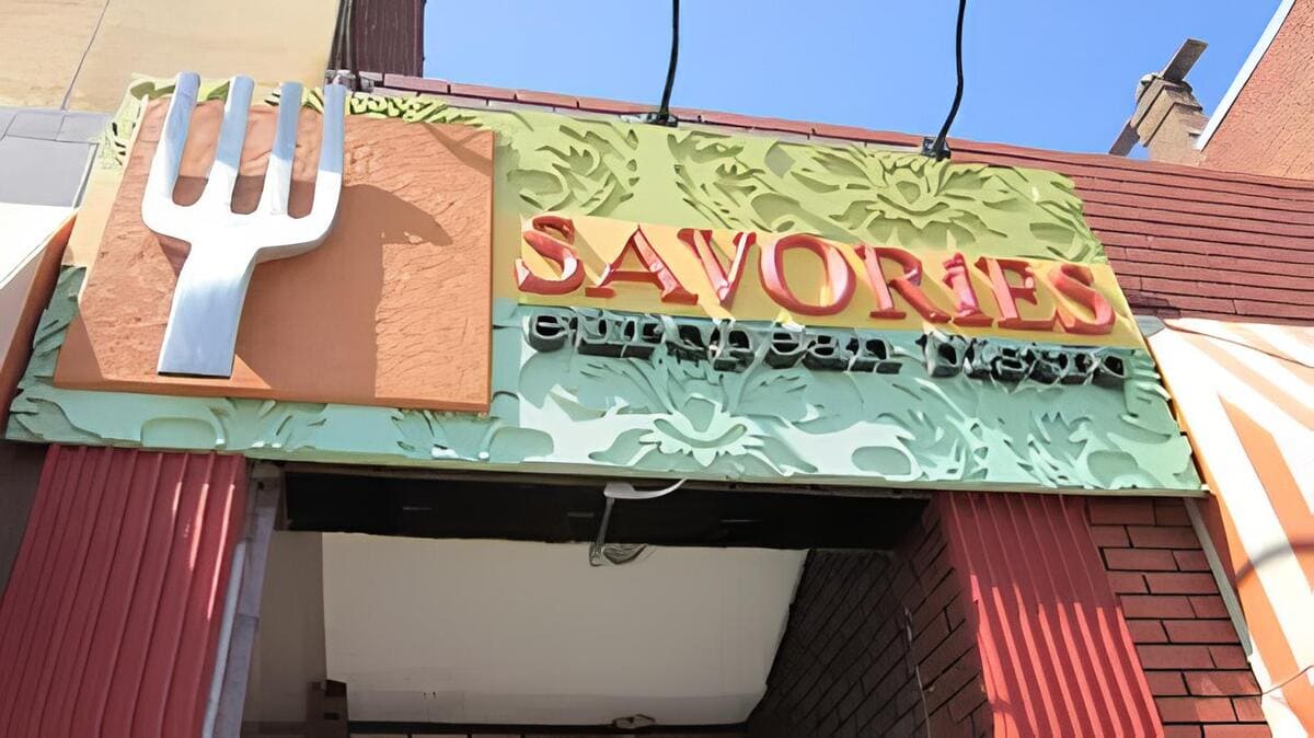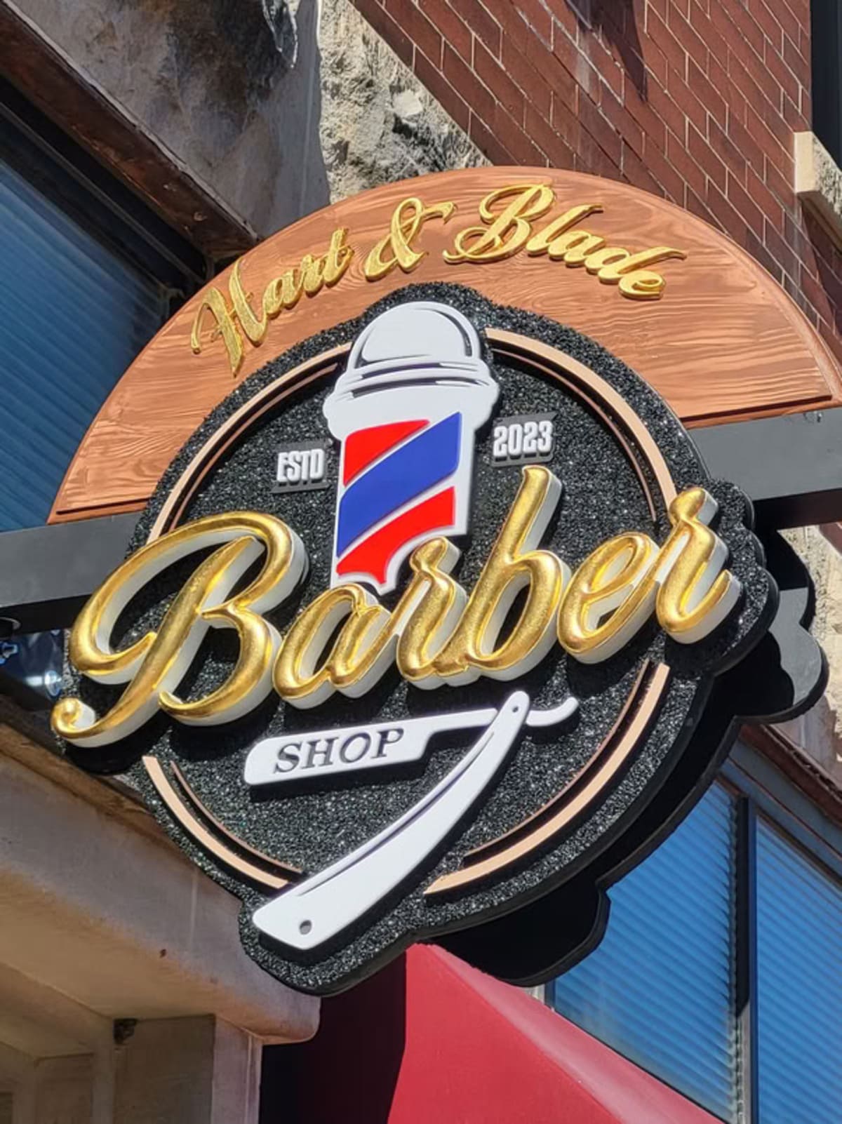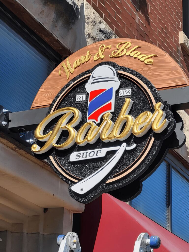 Double Sided “blade” projecting sign. Utilizing a Custom Powder Coated Bracket, and Multiple levels of Dimension with Acrylic, H.D.U., Smaltz, and Gold Leaf, and Faux painted Wood Grain